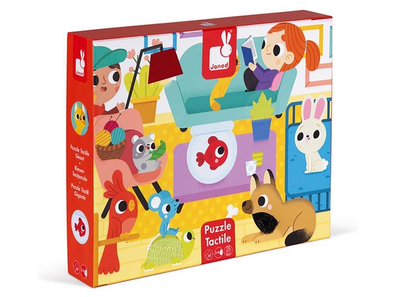 Тактильний пазл із зображенням домашніх улюбленців – оригінальна іграшка для дітей від 3-х років. Особливість цього пазлу в тому, що окремі частини картинки мають своєрідну текстуру. Загалом на пазлі 7 різних текстур на дотик. Виробник – французький бренд Janod.