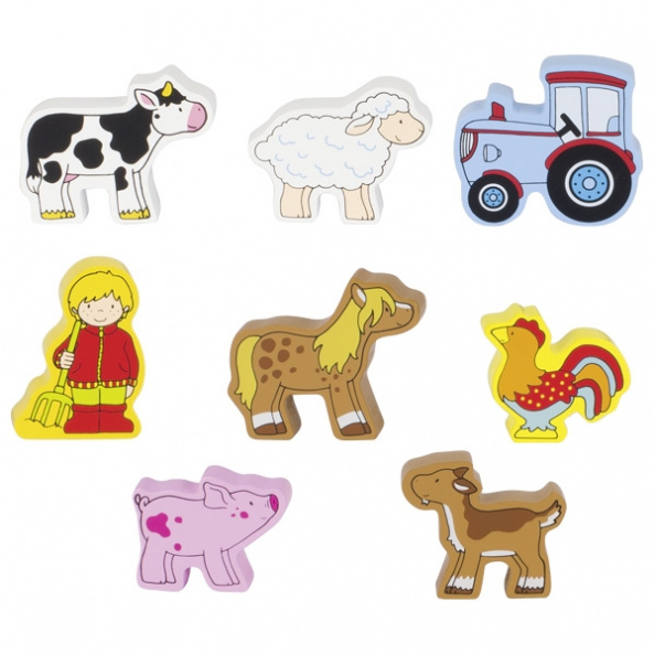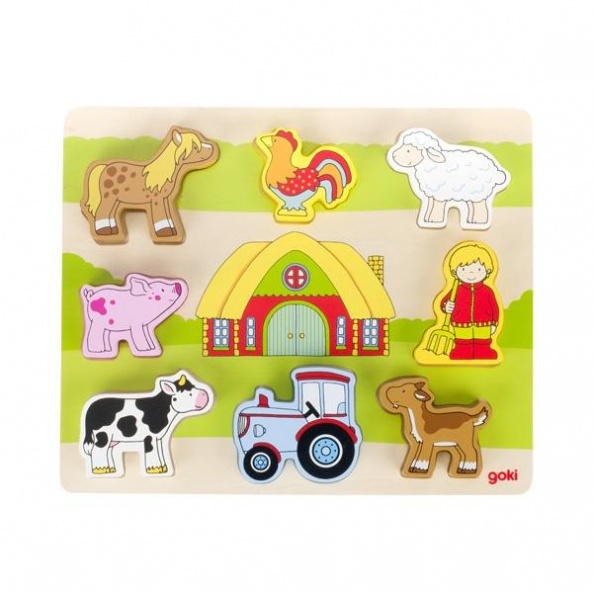 Тварини – наші менші друзі і це, безсумнівно, правда. Кожна матуся з дитинства привчає свого малюка любити тваринок та піклуватися про них. Дерев’яний пазл «Наша ферма» від німецького виробника goki – захоплива, розвивальна іграшка із зображенням свійських тварин. Пазл-вкладиш, складається з дошки основи і 8 вкладишів, які доповнюють зображення. Виріб виготовлений із натуральної деревини. Малюнок нанесений нетоксичними, безпечними фарбами. Розмір пазла – 28x23x2см. Рекомендований вік : 2+