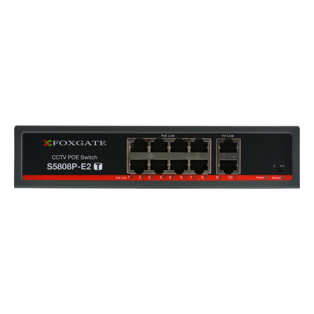 FoxGate S5808P-E2 (T) — це 8-портовий некерований PoE-комутатор для систем відеоспостереження. Комутатор підтримує стандарт IEEE 802.3af/at, це дає змогу живити пристрої з підтримкою PoE з максимальною потужністю до 30 Вт на порт. Це дає змогу зручно та гнучко розміщувати камери в будь-якому місці без потреби додаткового під'єднання до джерела живлення.