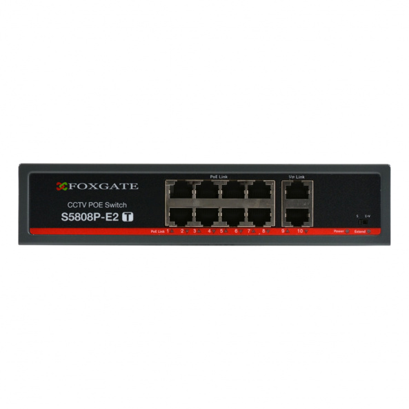 FoxGate S5808P-E2 (T) 8-портовий некерований PoE-комутатор для систем відеоспостереження. Порти доступу POE: 1-8 x FE RJ-45. POE живлення до 30 Вт на порт (IEEE802.3af/at). UPLINK-порти: 2xRJ-45 10/100 Мбіт/с. Наявність функцій VLAN і CCTV. Грозозахист портів 2 кВ. Оцинкований корпус. Вбудований БЖ AC 220 В (130 Вт / 52В 2.3A), POE бюджет до 120 Вт.