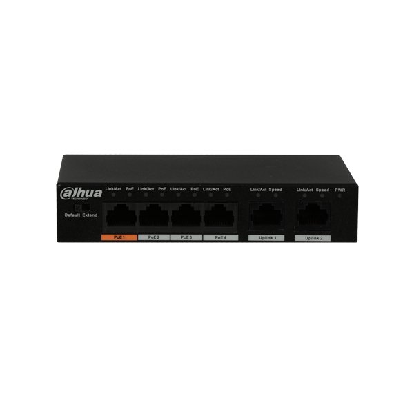 6-портовий некерований комутатор з 4 РоЕ портами. Мережеві порти: PoE: 4 порти - 10/100Mб/с; 2 порти - 10/100Mб/с; Протокол PoE: IEEE802.3af (PoE), 802.3at (PoE+), Hi-PoE; Відстань до споживача PoE: до 250м; Живлення: DC 48~57 В, максимальне навантаження на PoE - 60 Вт; Робоча температура: від -10° до +55°C; розміри 130x85x26 мм.