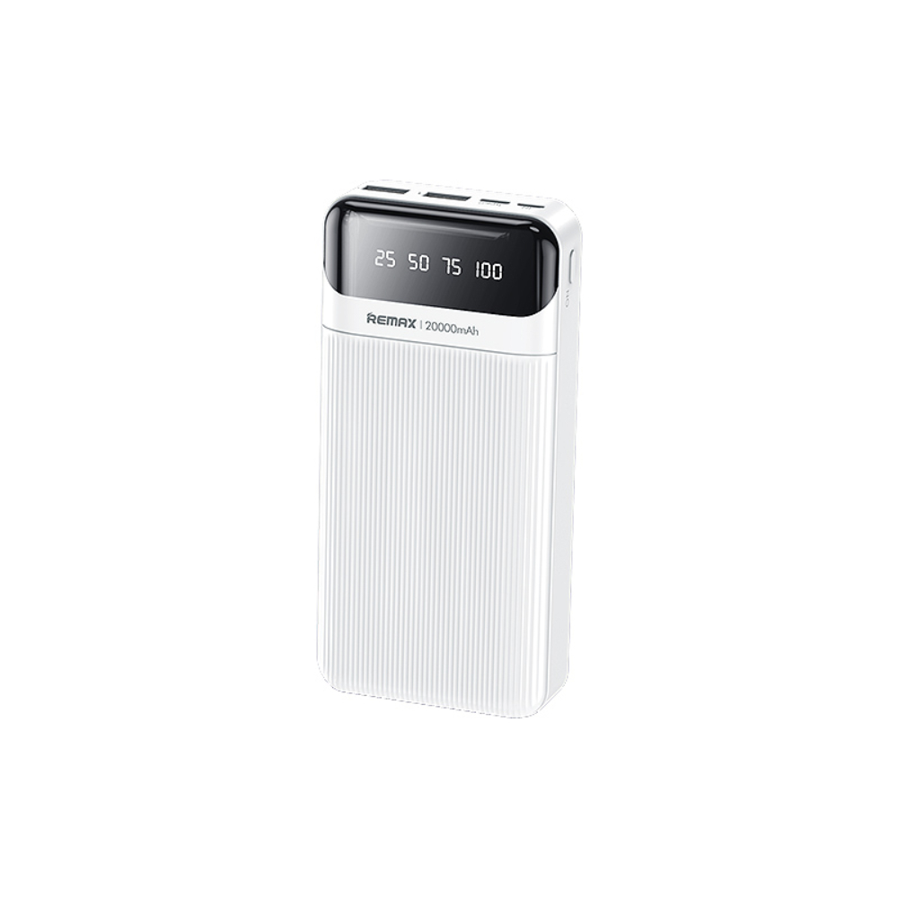 Повербанк REMAX FEB-102W ємністю 20000 мА·год з комплектом кабелів (micro USB/USB Type-C/Lightning) та цифровою індикацією з інформацією про стан заряду акумулятора.