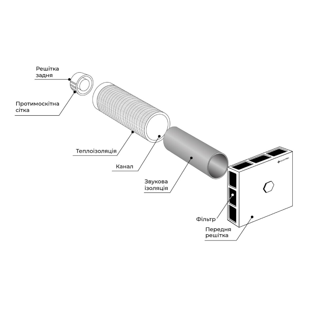 Пасивний припливний клапан (провітрювач) для вентиляції повітря. Клапан перекриття потоків. Фільтр очищення повітря G3. Труба довжиною до 1000 мм, діаметром 100 мм, передня панель 175х175х66 мм