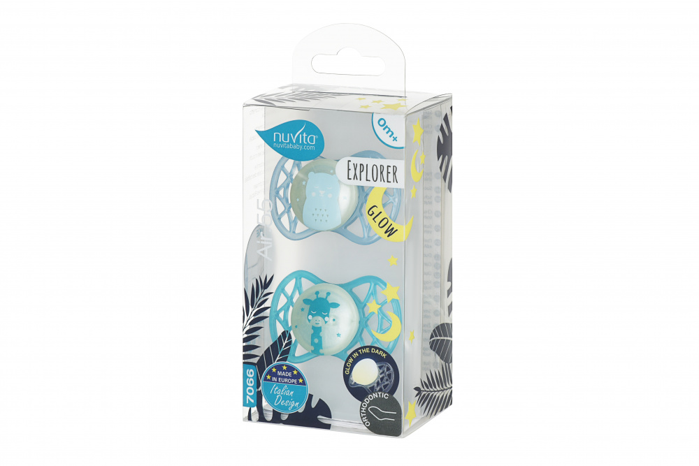Пустушка Nuvita NV7066 Air55 Explore ортодонтическая 0m + світиться в темряві (ведмедик, жираф). Пластина соски на 55% складається з повітря забезпечуючи майже повну аерацію області навколо рота, уникаючи скупчення слини, яка може подразнювати шкіру.