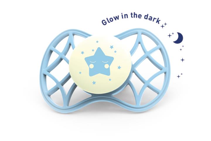 Ортодонтична пустушка Air55 Cool, яка світитися в темряві. Платівка соски на 55% складається з повітря забезпечуючи майже повну аерацію області навколо рота, уникаючи скупчення слини, яка може дратувати шкіру. Захисний ковпачок для соски для підтримки чистоти соски і стерилізації в мікрохвильовій печі простим додаванням води.