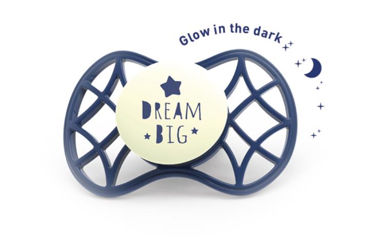 Опис товару Пустушка симетрична Nuvita NV7085 Air55 Cool 6m+ "DREAM BIG" світиться у темряві темно-синя