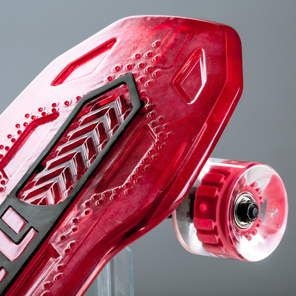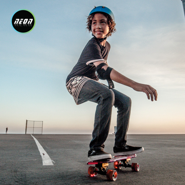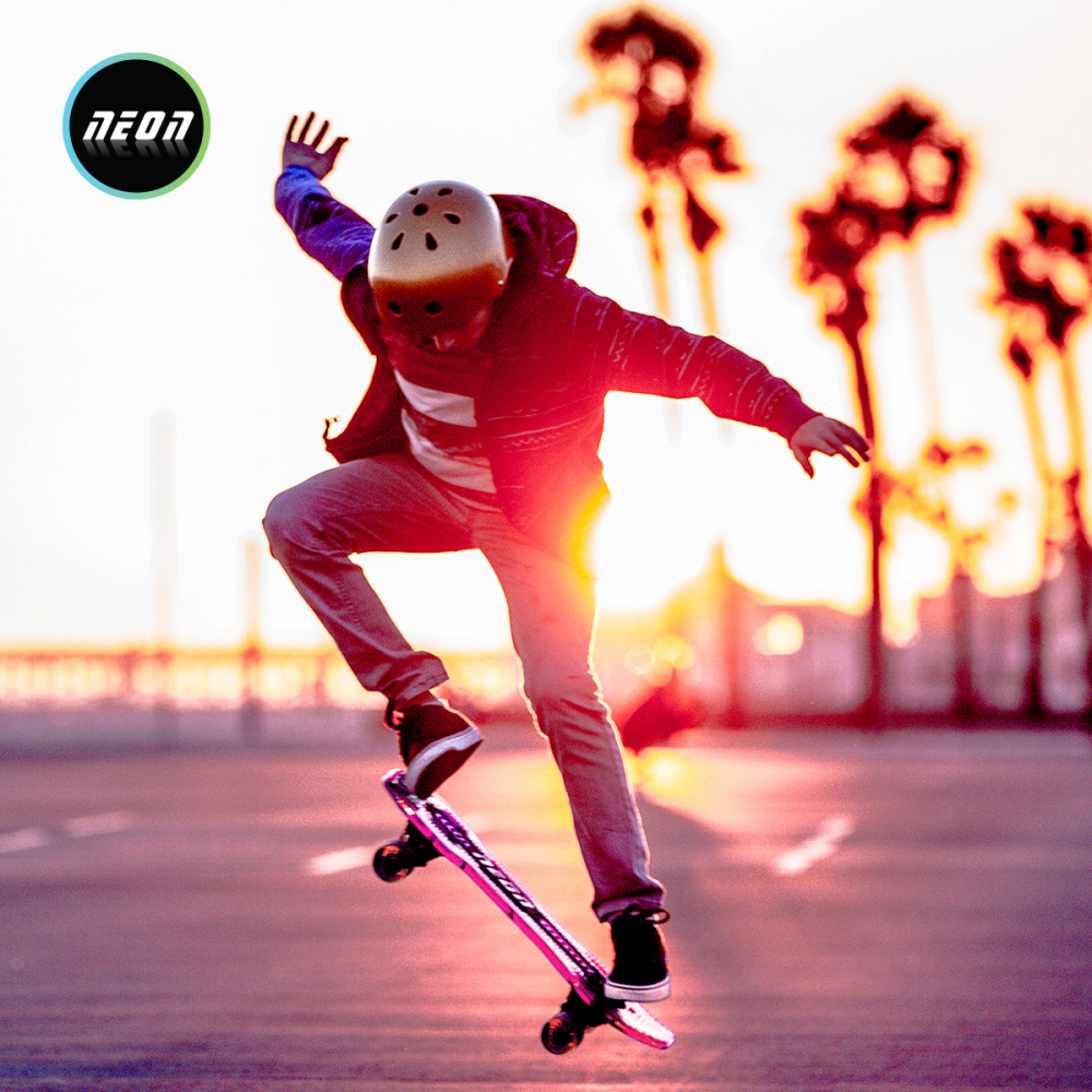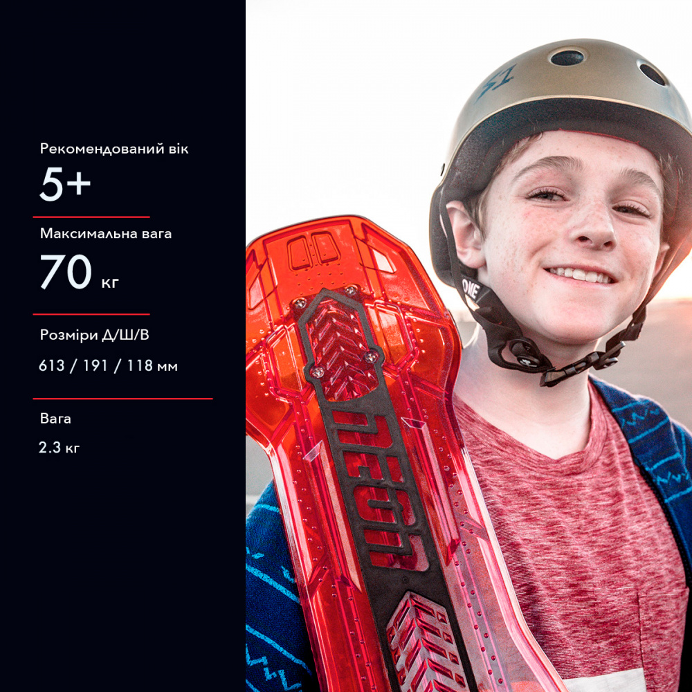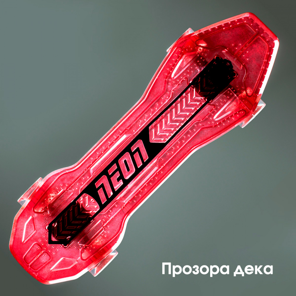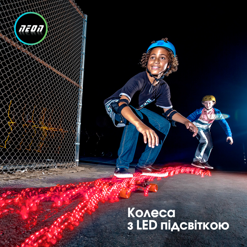 Якщо потрібен скейтборд для тривалого катання на довгі відстані - Neon Cruzer підходящий варіант для таких випадків. Якісна, безпечна, легка конструкція забезпечить комфортне та безпечне катання. Унікальність скейта в тому, що колеса світяться під час руху. Для цього не потрібно жодних батарейок. Якщо ж зупинитись - колеса перестануть світитись. Платформа червоного кольору, вона прозора. Дошка нековзка і має спеціальне гумове покриття. Витримає навантаження до 70 кг. Рекомендований вік: 5+.