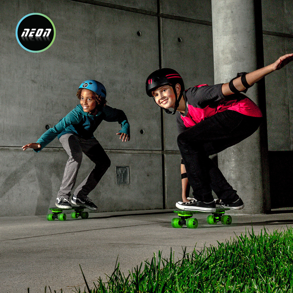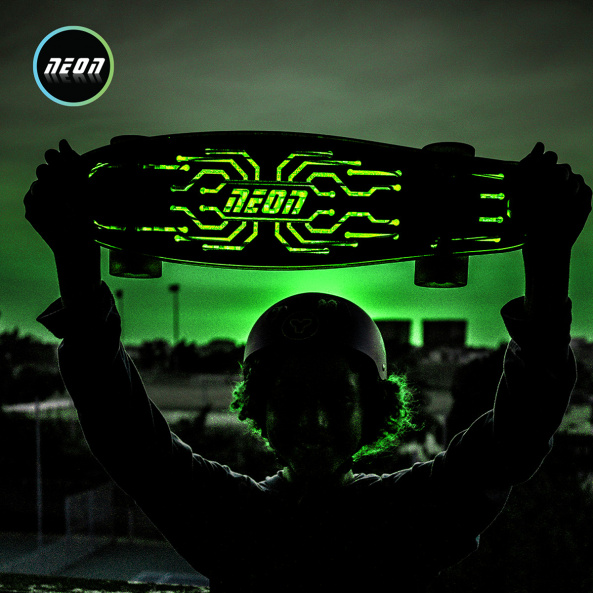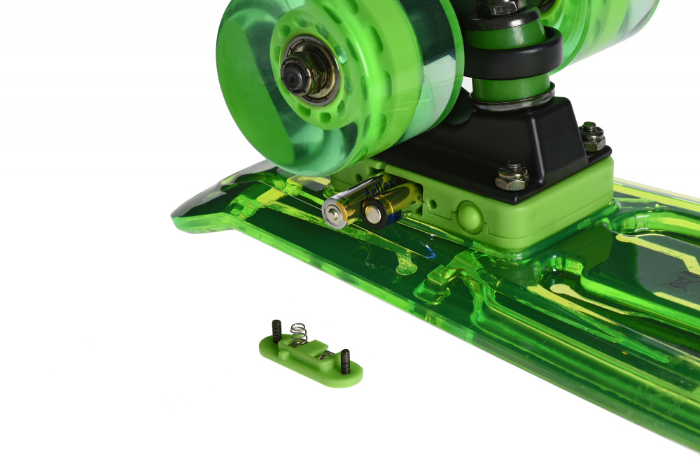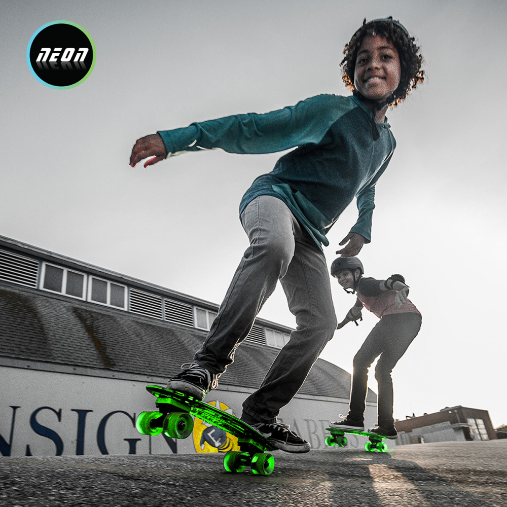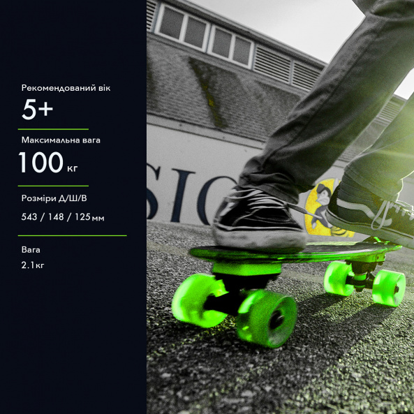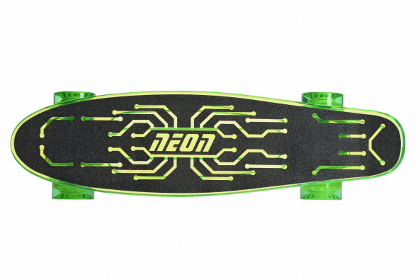 Скейтборд Hype із LED-підсвіткою – для катання і виконання видовищних трюків. Міцна, надійна дошка з наждачним покриттям, якісні поліуретанові колеса, компактний розмір – важливі деталі, що роблять катання комфортним. Особливість скейта Neon у тому, що він світиться. Просто ввімкніть підсвітку, натиснувши на кнопку, що над заднім колесом і дошка почне світитись. Дошка зеленого кольору, підійде як хлопчикам, так і дівчаткам. Скейтборд витримує навантаження до 100 кг, і навіть батьки зможуть перевірити транспорт на міцність. Рекомендований вік: 5+.