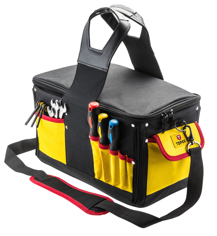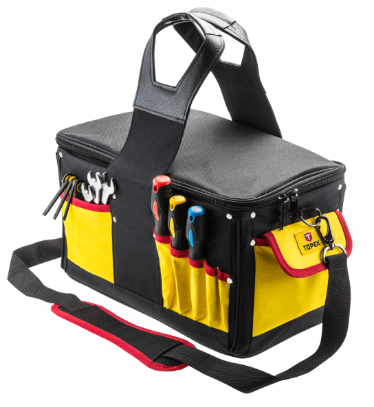Сумка для інструменту TOPEX з пластмаси, стійкої до ушкоджень, розміром 41 x 23 x 23 см. Велика кількість кишень - 16 зовні, а також 12 всередині сумки допомагають зберігати інструмент в порядку. Має міцні ручки і ремінь. Зміцнене дно дозволяє використовувати сумку для перенесення важких предметів. Сумка закривається на застібку-блискавку. Бренд TOPEX призначений для домашніх майстрів.