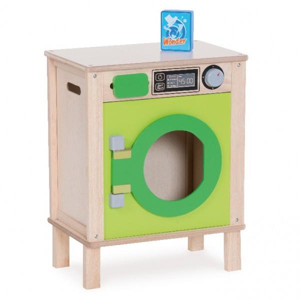 Пральна машина яскраво зеленого кольору – важливий елемент сюжетно-рольових ігор дітей, у яких вони зможуть уявити себе дорослими, повторюючи ті дії, що батьки виконують щодня. Деталі пральної машини з деревини та фанери. Перед початком гри, іграшку потрібно зібрати. Для цього вам знадобиться лише Х-подібна викрутка. Для дітей від трьох років. Іграшковий набір виробника Wonderworld (Таїланд) – бренду розвивальних безпечних іграшок.