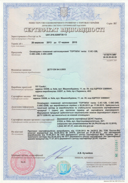 Оповіщувач світлозвуковий Тортіла С-05С-220, живлення 220В, акустична потужність 100дБ, пластиковий корпус. Встановлюється в закритому приміщенні. Підключається до охоронних і пожежних ППК.