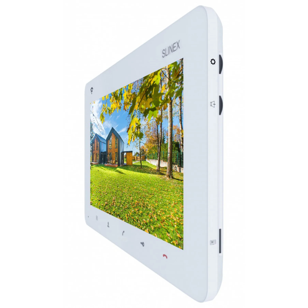 Кольоровий домофон з TFT екраном 7 дюймів з Wi-Fi, підключення 2 панелей виклику і 2 відеокамери будь-якого стандарту (AHD, TVI, CVI, CVBS), інтерком на 3 відеодомофони. Переадресація дзвінка на Slinex Smart Call. Розмова по гучному зв'язку. Слот microSD до 256 Гб, джерело живлення 100-240V, споживання 8 Вт, в режимі очікування 4 Вт. Корпус білого кольору. Розміри: 193 х 123 х 18 мм. Робоча температура: -10 ... + 55˚C.