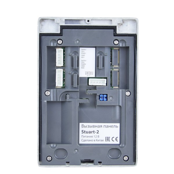 КАМЕРАВбудована камера з фіксованим об'єктивом, роздільною здатністю 800 ТВЛ і кутом огляду 110°.КОРПУСКорпус відеопанелі Stuart-2 виконано з литого алюмінію. Клас захисту IP54 (система класифікації ступеня захисту оболонки електрообладнання), що означає надійний захист внутрішніх компонентів від потрапляння пилу і вологи (RH95%