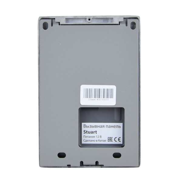 КАМЕРАВбудована камера з фіксованим об'єктивом, роздільною здатністю 800 ТВЛ і кутом огляду 110°.КОРПУСКорпус відеопанелі Stuart-4 виконано з литого алюмінію. Клас захисту IP54 (система класифікації ступеня захисту оболонки електрообладнання), що означає надійний захист внутрішніх компонентів від потрапляння пилу і вологи (RH95%