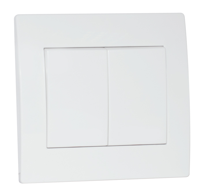 Вимикач подвійний у двох кольорах. Основа з оцинкованої сталі. Мідні контакти зі срібним покриттям. Можливість управління двома джерелами світла. Матеріал корпусу – негорючий PC-пластик.