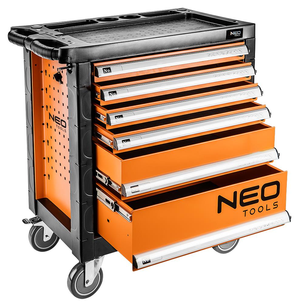 Скриня інструментальна NEO розмірами 770x460х870 мм. Шафа має 6 практичних шухляд для інструменту, що замикаються за допомогою центрального замка. Всі шухляди повністю висуваються, мають напрямні на роликах, які забезпечують надійність функціонування на довгі роки. Шухляди забезпечені спусковим фіксатором, який виконує функцію захисту оточуючих під час транспортування. Широка робоча поверхня з міцного композитного матеріалу у сполученні з заглибленнями для усіляких дрібничок, а також спеціальним місцем для напрямної підвищують корисні властивості цього продукту. Наріжні накладки проти оббивання підвищують безпечність експлуатації щодо оточення. П’ятидюймові поворотні коліщатка, що працюють дуже тихо й обладнані фіксаторами, спрощують маневрування шафкою. Навантаження на шафу 200 кг. Шафа обладнана зручною гумованою ручкою, яка спрощує транспортування.