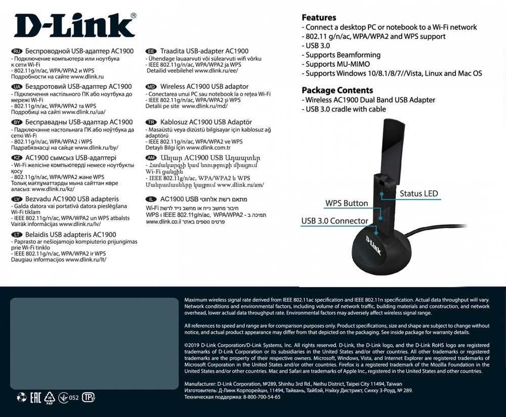 Характеристики товару WiFi-адаптер D-Link DWA-192, AC1900, MU-MIMO, USB 3.0