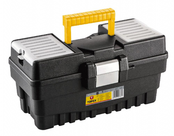 Ящик для інструменту ТОРЕХ - це практичний і міцний контейнер для інструменту, виготовлений з міцної пластмаси, з алюмінієвим замком. Ящик оснащений 2 органайзерами для зберігання дрібних елементів, ложементом і зручною ручкою для перенесення. Є зручні бічні ручки. Бренд TOPEX призначений для домашніх майстрів.