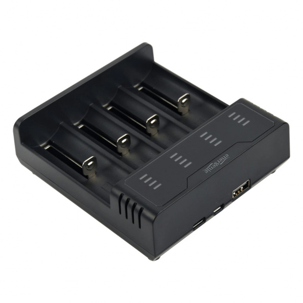 Зарядний пристрій EnerGenie BC-USB-02 підходить для заряджання літій-іонних акумуляторів типів 26650, 22650, 18650, 18500, 17500, 14500, 16340 і Ni-MH / Ni-CD акумуляторів типів A, AA, AAA, SC, C. Пристрій має 4 незалежні канали для заряджання акумуляторів.