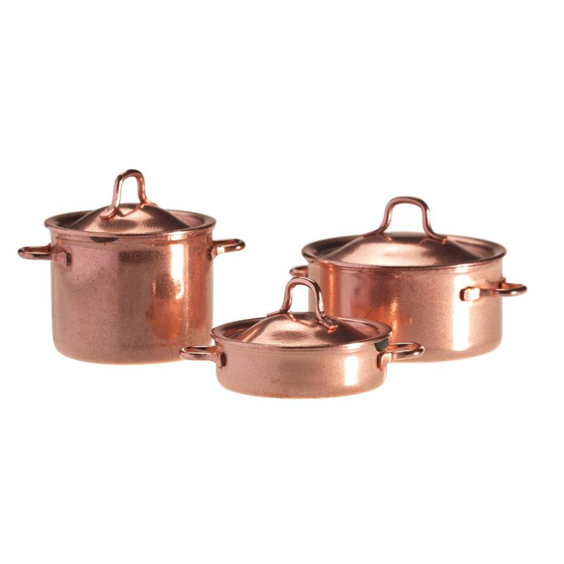 Незамінна річ на ляльковій кухні - набір металевого посуду мідного кольору. Набір іграшкового посуду німецького виробника іграшок nic – це 3 мініатюрних предмета кухонного приладдя для лялькових будиночків Bodo Hennig. Всі предмети виконані із червоного металу і виглядають зовсім як «дорослі»! Каструлі мініатюрного розміру, вироблені дуже філігранно. Іграшковий посуд постачається у зеленій коробочці. Набір посуду адаптований для дітей від 3-х років.