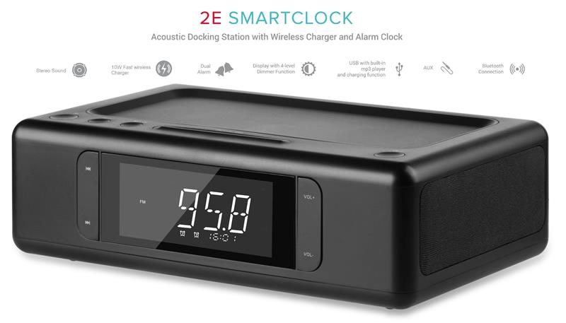 Завдяки 2E SmartClock класичний настільний будильник-годинник перетворюється на стильний багатофункціональний пристрій, який буде чудовим рішенням для дому та офісу. Стильний, сучасний і компактний зовнішній вигляд, який впишеться в будь-який інтер'єр, містить годинник, будильник, FM-радіо, акустичну систему і бездротову зарядку. Благодаря 2E SmartClock классический настольный будильник-часы превращается в стильное многофункциональное устройство, которое будет отличным решением для дома и офиса. Стильный, современный и компактный внешний вид, который впишется в любой интерьер, содержит в себе часы, будильник, FM-радиоприемник, акустическую систему и беспроводную зарядку.