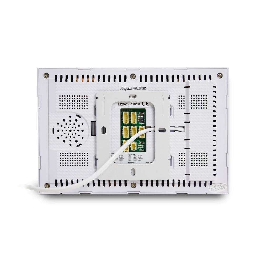 Цветной домофон с Wi-Fi, с сенсорным IPS экраном 7 дюймов, подключение: 2 видеопанели, 2 аналоговые камеры, 2 датчика к тревожным NO входам. Детектор движения на 1 канал. Разговор по громкой связи, интерком. Соединение с видеопанелью 4-проводное. Слот microSD до 256 ГБ, питание 100-240В (встроенный БП), потребление 1.5A, в режиме ожидания 600мА. Корпус белого цвета. В комплекте 3 декоративные сменные рамки: White, Oak, Graphite. Размеры 205х139х26.5 мм.