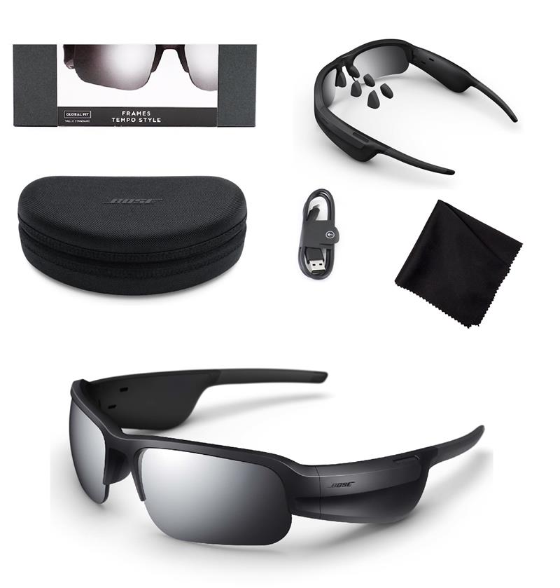 Bose Frames Tempo – спортивные солнцезащитные аудио-очки с защитой от пота и брызг, аэродинамической оправой, силиконовыми носовыми упорами и поляризационными сменными линзами.