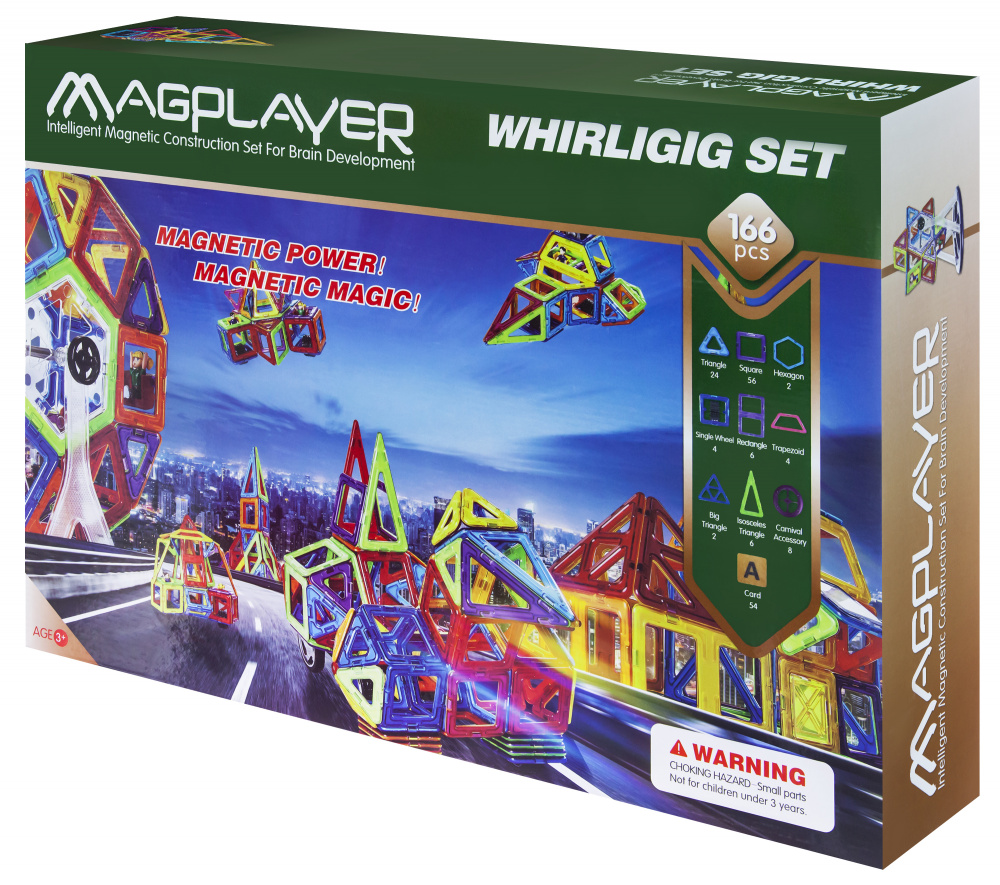 MagPlayer – це магнітний конструктор, що розвиває у дітей креативність, логіку, мислення та моторику рук. Набір складається з 166 елементів різної форми та кольорів: трикутників, квадратів, шестикутників, трапецій, а також деталей з коліщатками і буквами. По периметру кожної деталі розміщені магніти, тому фіксація між ними міцна та надійна. Велика кількість різноманітних деталей дозволяє створити безліч фігурок: будиночків, автомобілів, ракет, тварин, дерев та геометричних фігур. Набір комплектується великою схемою для створення найрізноманітніших фігур.