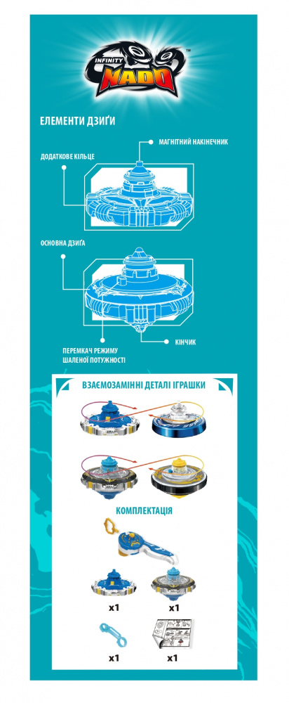 Откройте для себя новые складываемые волчки Infinity Nado! С помощью магнитного лаунчера усильте спиннер, прежде чем запустить его на арену. Чтобы войти в режим атаки, добавьте дополнительное кольцо на волчок: используйте магнитный лаунчер, чтобы установить кольцо на спиннер во время боя на арене, чтобы повысить мощность и скорость. Когда ваш спиннер замедлится, вы можете усилить его во время боя на арене и добавить большую скорость! Попробуйте новую стратегию, складывая новые кольца (продаются отдельно) на спиннер, чтобы увеличить их силу против вашего противника. Набор состоит из магнитного лаунчера, металлического вращающегося основания, металлического кольца, которое можно добавить во время боя, и инструмента для сборки.