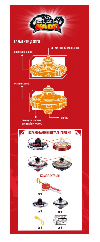 Откройте для себя новые складываемые волчки Infinity Nado! С помощью магнитного лаунчера усильте спиннер, прежде чем запустить его на арену. Чтобы войти в режим атаки, добавьте дополнительное кольцо на волчок: используйте магнитный лаунчер, чтобы установить кольцо на спиннер во время боя на арене, чтобы повысить мощность и скорость. Когда ваш спиннер замедлится, вы можете усилить его во время боя на арене и добавить большую скорость! Попробуйте новую стратегию, складывая новые кольца (продаются отдельно) на спиннер, чтобы увеличить их силу против вашего противника. Набор состоит из магнитного лаунчера, металлического вращающегося основания, металлического кольца, которое можно добавить во время боя, и инструмента для сборки.