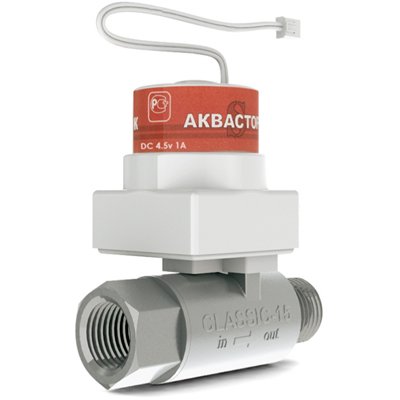 Кран Аквасторож CLASSIC-15, типоразмер 1/2", диаметр прохода 14мм, давление жидкости 16 бар, время на закрытие/открытие 2.5 сек, напряжение питания 4.5В, макс потребляемая мощность 5Вт, длина провода 1.8м, макс удаление от контроллера 30м, t°С +1...90°С, 82х85х44мм Шаровой кран КЛАССИК-15 типоразмер 1/2 дюйма, диаметр прохода 14мм.