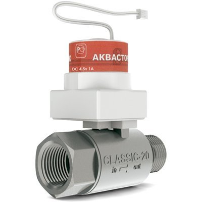 Кран Аквасторож CLASSIC-20, типоразмер 3/4", диаметр прохода 20мм, давление жидкости 16 бар, время на закрытие/открытие 2.5 сек, напряж пит 4.5В, макс потреб мощ 5Вт, длинна провода 1.8м, максим удал от контроллера 30м, t°С +1...90°С, 87х94х44мм