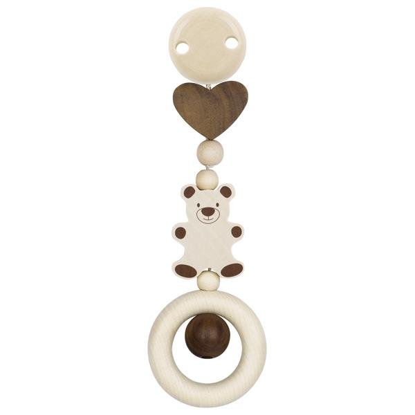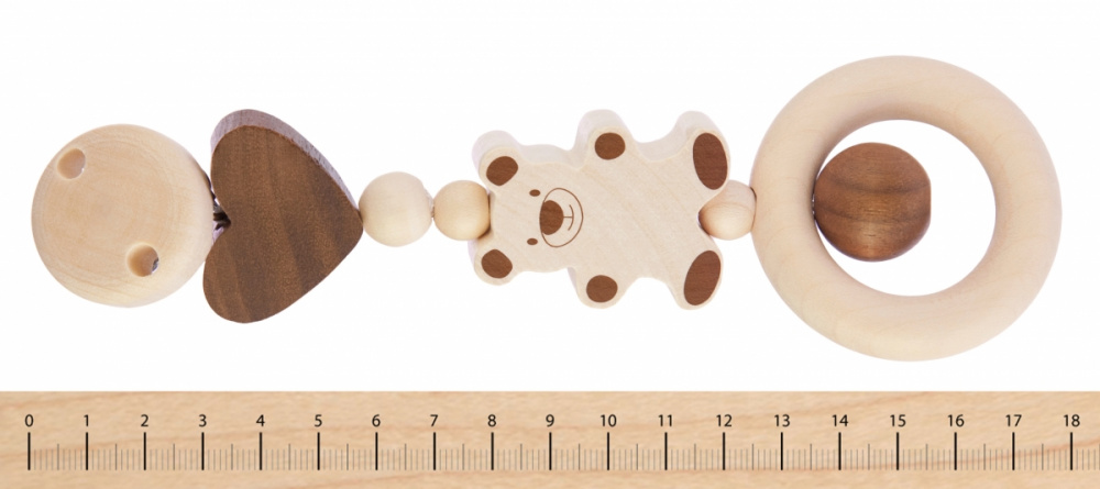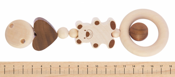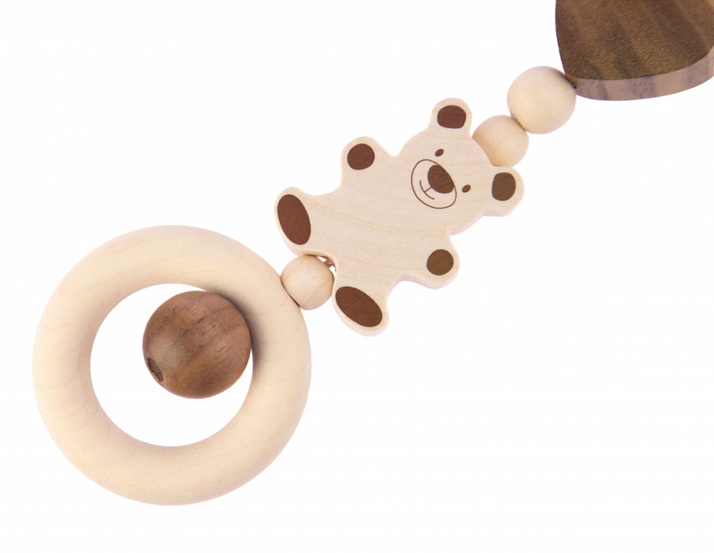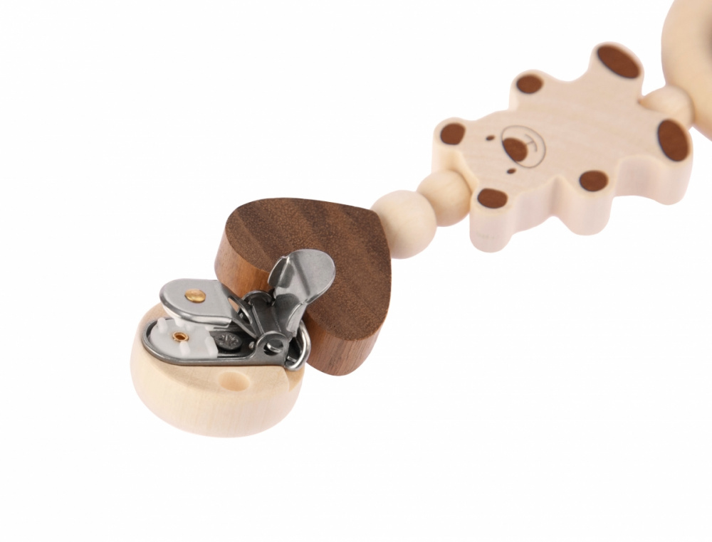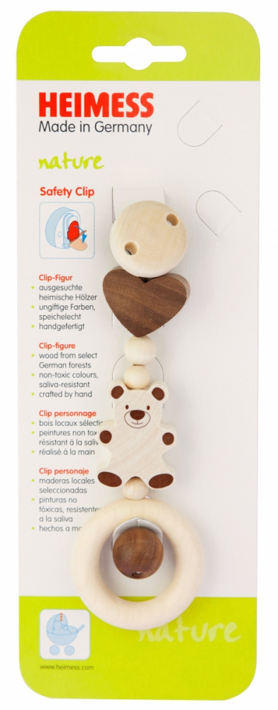 Екологічне брязкальце на кліпсі «Ведмедик» від німецького бренду Heimess вироблене виключно із натурального дерева молочного і коричневого кольору. Металева кліпса чіпляється за ліжечко або коляску, а природні дерев’яні елементи різних форм та розмірів будуть приваблювати дитину. Деталі оброблені дуже якісно, тож можете не хвилюватись за безпеку дитини. Кліпса «Ведмедик» має велике розвиваюче значення. Завдяки такому аксесуару, дитина буде розвивати зір, моторику рук, відчуття розмірів та матеріалів.