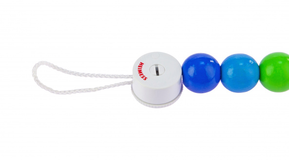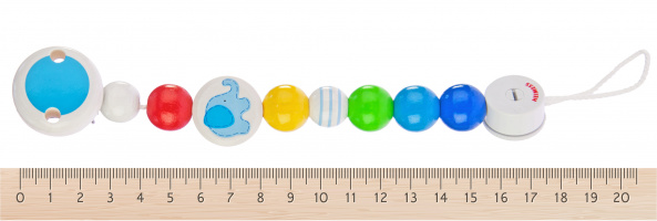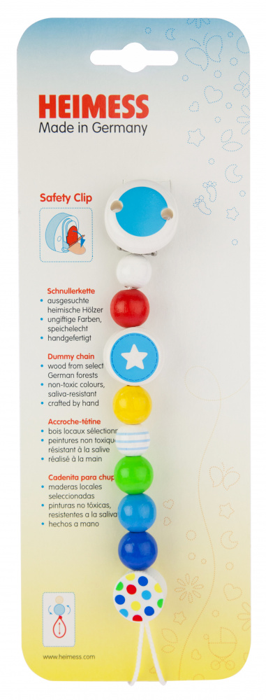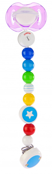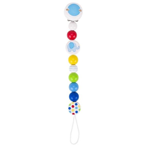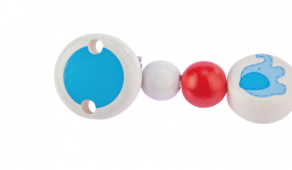 Яскрава кліпса для пустушки «Слоненятко» від німецького бренду Heimess для найменших. Кліпса зроблена з натуральної деревини, елементи якої просочені фарбами на водній основі. З одного кінця ланцюжка аксесуар має кліпсу, яка фіксується на одяг, а з іншого – петлю, яка вдягається на пустушку. При необхідності довжину петлі можна регулювати за допомогою спеціального регулятора. Таким чином соска вашої дитини ніколи не загубиться. Різноманітні за формою та кольором кульки аксесуара будуть цікавими для дітей. Кліпса допоможе розвити дрібну моторику, зір та сприйняття кольорів.
