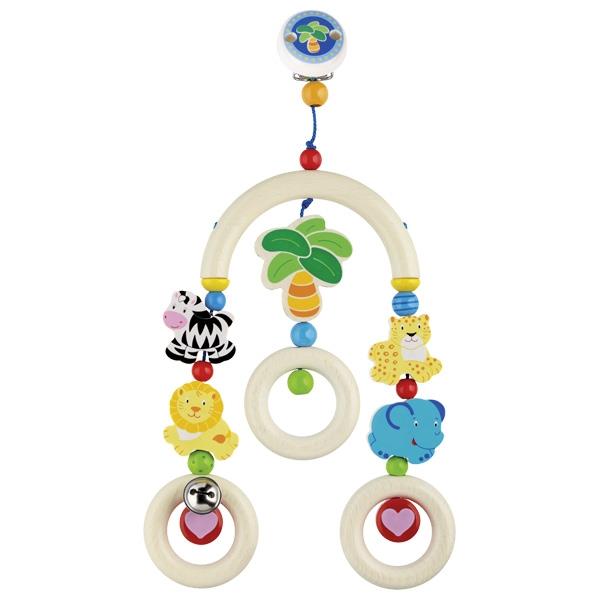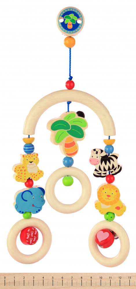 Класична дерев’яна іграшка «Африка» він німецького бренду Heimess для малюків. Мобайл має кліпсу для розміщення його над дитячим ліжечком або візочком. Його можна не тільки розглядати, а й хапати, гризти, тягнути тощо. Завдяки мобайлу дитина познайомиться з левом, зеброю, леопардом та слоником, що колихаються під африканською пальмою. Мобайл прикрашений маленьким металевим дзвіночком для тренування слуху. Частини мобайлу зроблені з натурального дерева, яке просочують кольоровими фарбами на водній основі. Металеві частини не викликають алергії, а фарба нетоксична і тримається дуже міцно.