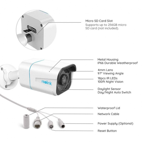 Reolink RLC-810A – 8 мегапиксельная камера с разрешением 3840x2160. Поддержка Power over Ethernet (PoE). Слот для карт памяти Micro SD (макс. 256 ГБ). Обнаружение движения; обнаружение людей; обнаружение транспортных средств; обнаружение домашних животных (бета-версия). Режимы записи: Запись, инициируемая движением (по умолчанию); запись по расписанию; запись 24/7. Встроенный микрофон.