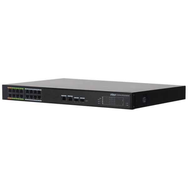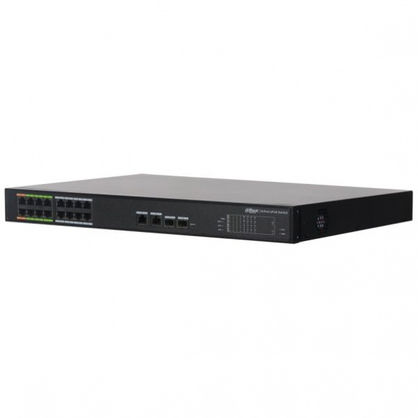 18-портовый управляемый POE коммутатор. Downlink порты: 16x RJ45 (100M) с поддержкой ePoE по 8-портам; Uplink порты: 2x RJ45 (1000M) или 2x SFP (1000M) комбо. Протоколы: 802.3af / at, Hi-PoE; AC 100-240В. Бюджет PoE - 240Вт; -10 до +55C; 440x300x44 мм.