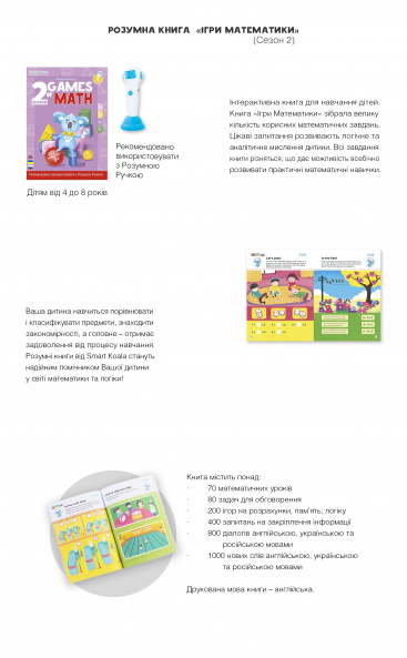 Игры математики: сезоны 1-2-3-4 состоят из 70 математических уроков в каждой книге; 200 игр на вычисления, память, логику; до 80 задач для обсуждения, аудио сопровождение английским, украинским, русским языками. Рекомендуется использовать с Умной Ручкой.