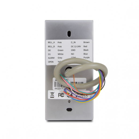 Антивандальная кодовая клавиатура, встроенный считыватель проксимити , 2000 кодов и карт, расстояние считывания карт до 6см, импульсный режимы работы, металлический корпус, степень защиты: IP68, рабочее напряжение DC 12V/0.03A, выход реле ( NO,COM,NC), звонок, кнопка выхода, сирена, интерфейс Wiegand 26, датчик состояния дверей