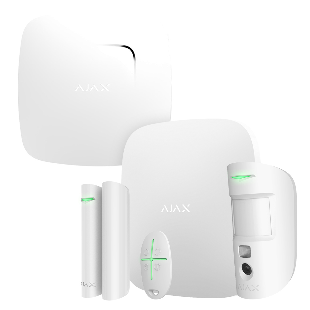 Комплект беспроводной сигнализации Ajax StarterKit Cam Plus white + FirePtotect Plus white – комплект сигнализации для обеспечения безопасности дома и офиса с фотоверификацией тревог, работающий по беспроводной технологии Jeweller / Wings, поддерживает 5 каналов связи – Wi-Fi, Ethernet, 2G, 3G, LTE.