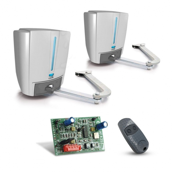 Комплект автоматики для распашных ворот шириной до 2.3 м и весом до 300 кг с возможностью установки на широкие столбы. В комплект входят: приводы с концевыми выключателями, один из которых со встроенной панелью управления – 2 шт., радиоприемник одноканальный 433 МГц – 1 шт., пульт ДУ двухканальный – 1 шт. Интенсивность использования 30%, вращающий момент 180Нм, время открывания на 90° 18сек., мощность 160Вт, питание 230В