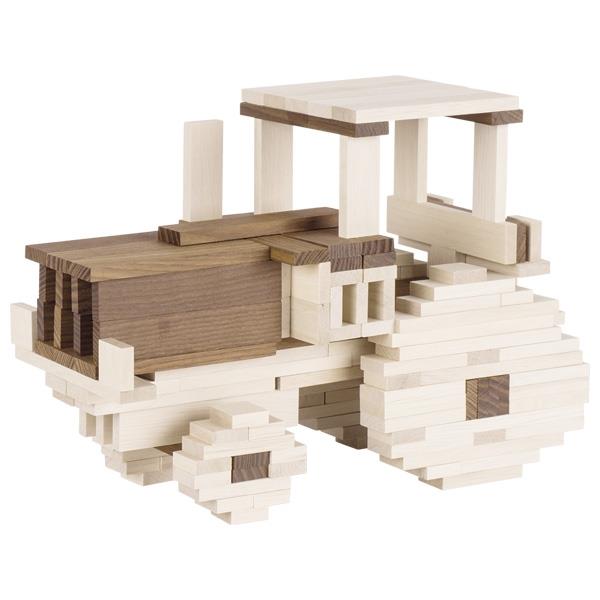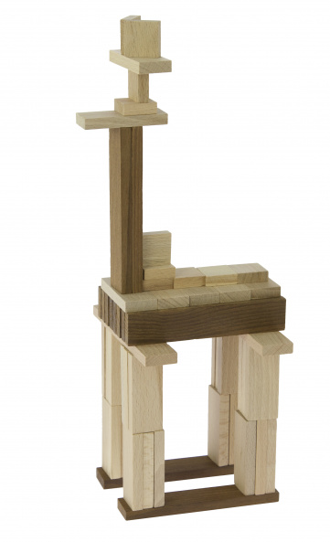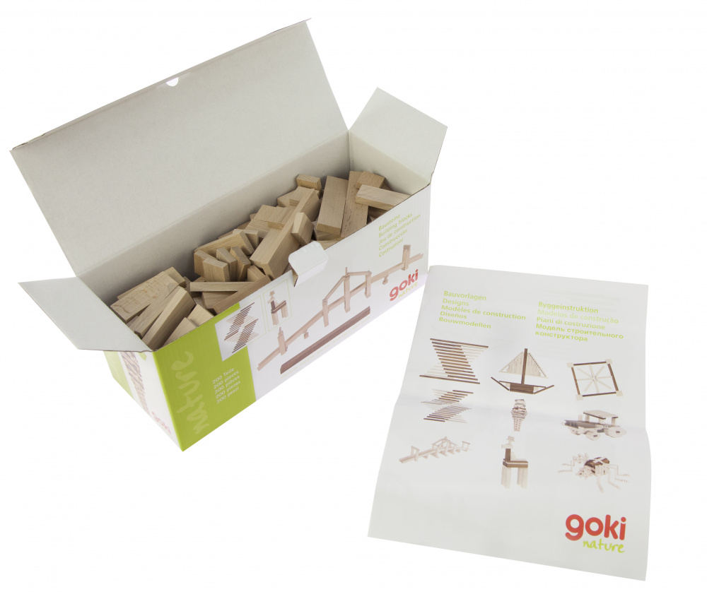 Дерев’яний конструктор зроблений із високоякісних порід дерев: сосни, берези, ясена. Частини конструктора представлять собою блоки білих і коричневих кольорів. Такий конструктор допоможе дитині будувати автомобілі, кораблі, мости та абстракції виключно з екологічних матеріалів. Конструктор німецького виробника іграшок goki допоможе дитині розвивати уважність, посидючість та уяву.