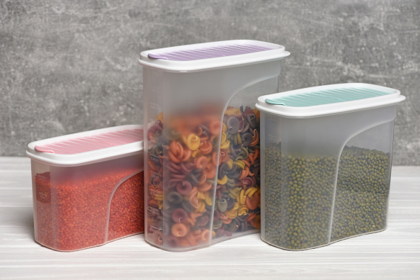Прозрачный пластиковый контейнер для сыпучих продуктов с гибкой крышкой и клапаном.