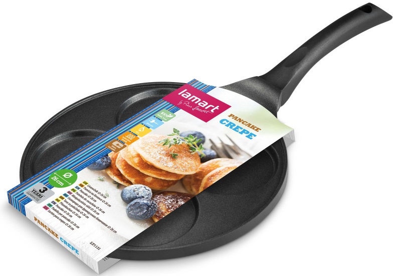 Сковорода для французких блинчиков Lamart LT1131. Антипригарный материал без использования ПФОК (отсутствие токсичных испарения во время перегрева). Эргономичная ручка с мягкой вставкой. Качественная алюминиевая посуда с великолепным антипригарным покрытием. Простота обслуживания и чистки.