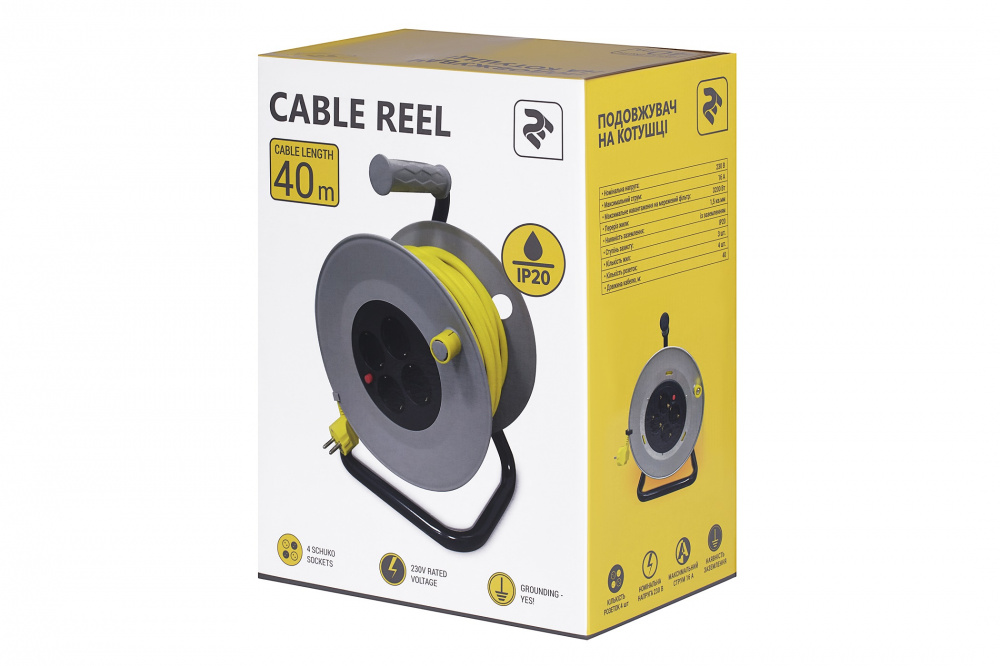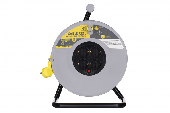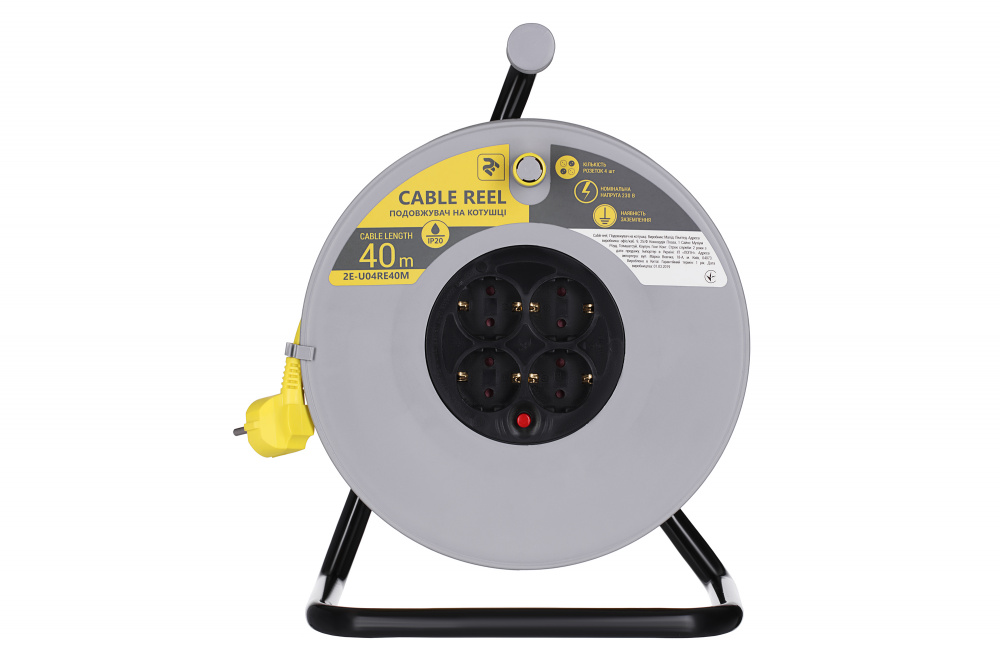 Описание товара Сетевой удлинитель 2Е 4XSchuko на катушке, с заземл., ІР20, 3G*1.5мм, 40м, серо-желтый