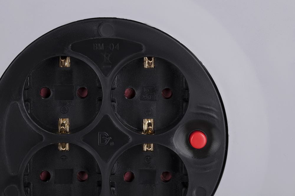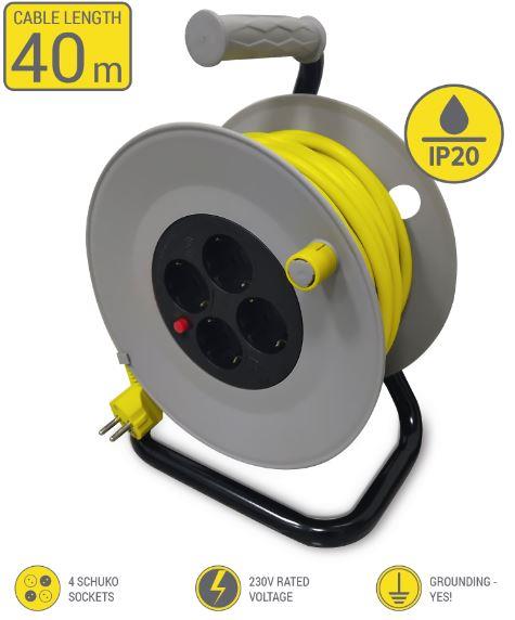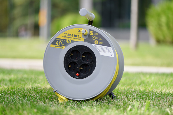 Удлинитель на катушке на 40 м с четырьмя розетками евростандарта с заземлением (Schuko), удобной ручкой и защитой IP20. Эта модель использует трехжильный кабель с сечением 1.5 мм2 (3x1.5mm). Кабель устойчив к неабразивным поверхностям, ультрафиолету и нефтепродуктам.