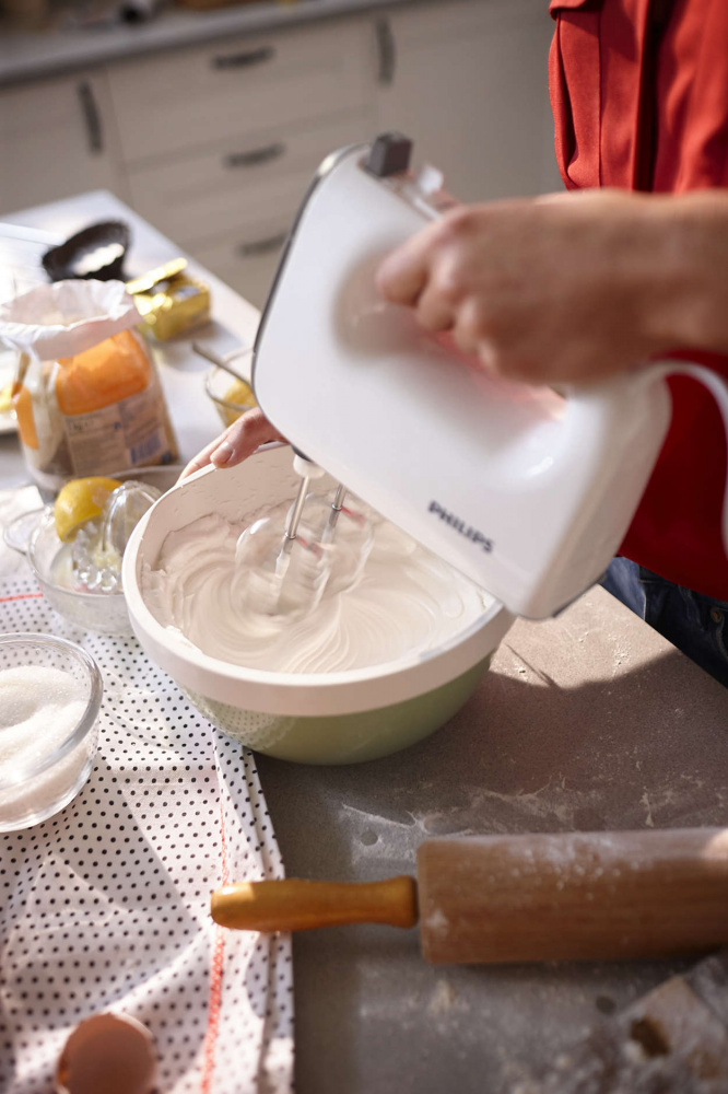 Міксер Philips допомагає випікати смачні пухкі торти і хліб для всієї сім’ї. Конічне змішування для насичення киснем дозволяє швидше збивати і змішувати однорідніше рідке тісто на торт. Його потужний двигун 450 Вт легко замісить навіть найгустіше тісто.