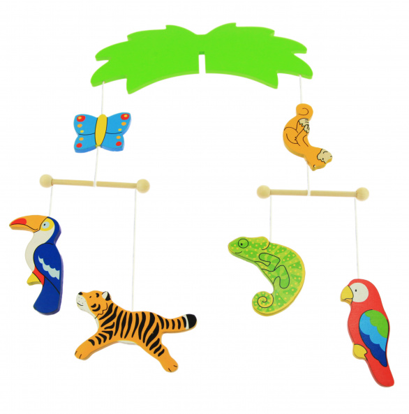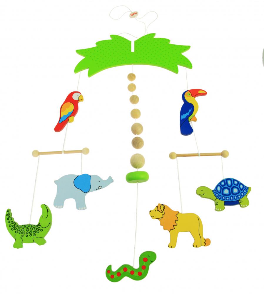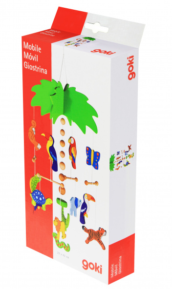 Дитячий дерев’яний мобіль німецького виробника іграшок goki – це необхідна розвиваюча іграшка для немовлят. Мобіль «Пальма» привертає увагу своєю яскравістю та цікавинками. Дванадцять кольорових тваринок та птахів сховалися під листями зеленої пальми. Дитяча іграшка почне кружлятись навіть від найменшого руху повітря. Деталі зроблені із натуральної деревини та вкриті водостійкими фарбами, що абсолютно безпечні для дитини. У майбутньому мобіль може стати прикрасою в дитячій кімнаті.