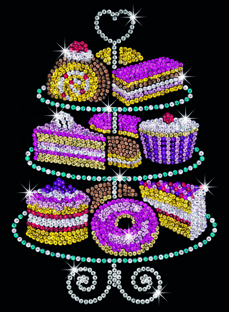 Картина с пайеток на черной бархатной основе с изображением пирожных украсит стены маленького кафе - детского или настоящего взрослого. В основу с пенопласта, согласно схеме, прикрепляются цветные пайетки с помощью маленьких шипов. В заключении - вы получите красивую, стильную, блестящую картину! В наборе есть все необходимое, в том числе: пенопластовая основа 25х34 см, бархатная база в точку, упаковки с пайетками разных цветов, шпильки и инструкция. Аппликация пайетками - интересный и увлекательный процесс, который требует внимательности, усидчивости и аккуратности. Рекомендуемый возраст: 8+