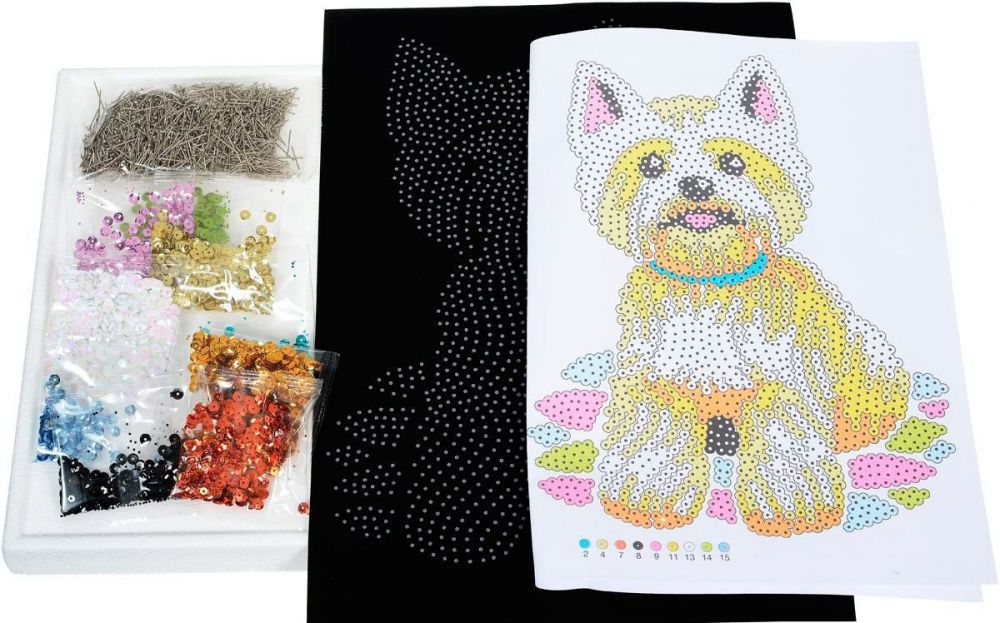 Вест-хайленд-уайт-терьер с пайеток на черной бархатной основе. Набор для творчества от Sequin Art позволит вам вышить такую блестящую картину и украсить ею вашу комнату. В основу с пенопласта, согласно схеме, прикрепляются цветные пайетки с помощью маленьких шипов. В заключении - вы получите красивую, стильную, блестящую картину! «Вышивка» пайетками - интересный и увлекательный процесс, который требует внимательности, усидчивости и аккуратности. Рекомендуемый возраст: 8+